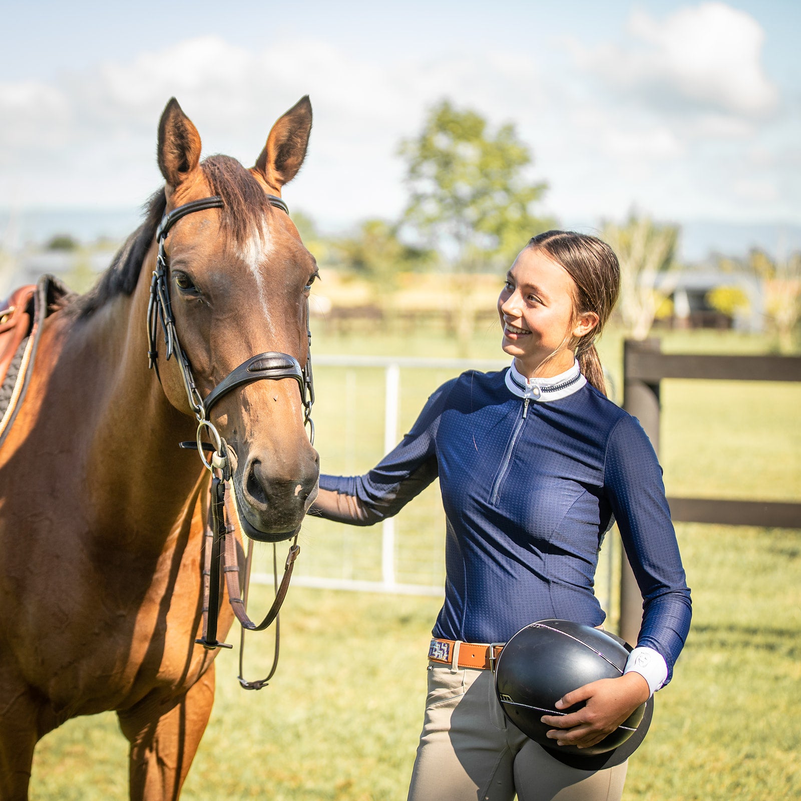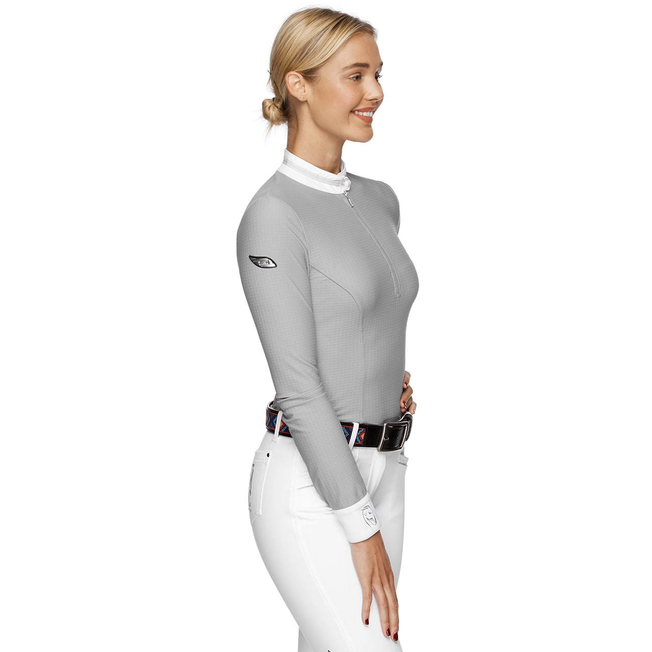 Alice is a women's competition shirt constructed with soft sports all way stretch fabric, providing comfort and performance. It features long sleeves with breathable under arm mesh panels, perfect to keep you cool while doing physical activities around horses. Experience the ultimate fit and performance with Alice.